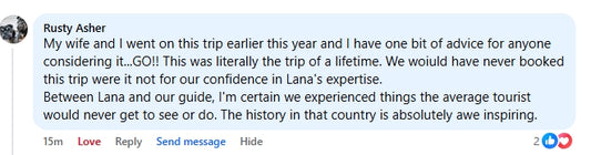 This was a fantastic experience and an amazing country. Lana was a great guide and definitely loves what she does and shared that with all us travelers. I never was concerned and always felt well looked after. Between Lana and our wonderful Egyptian agent Ahmed we got to see everything we wanted and more. Secret trips into the bowels of the pyramids, a gorgeous hotel right on the Nile and all the history we could wish. Both our guides were obviously in love with this beautiful and historical country and it showed in all we experienced. Thanks to both!