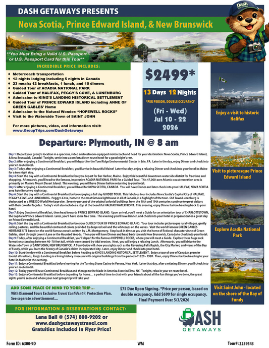 Jul 10-22, 2026: Hidden Gems of the North: Nova Scotia, Prince Edward Island & New Brunswick: Pick Up Locations: Merrillville, Plymouth & Ft. Wayne