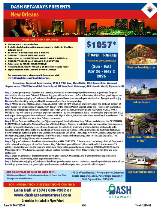 Included Highlights: Motorcoach transportation, six nights lodging with four nights in New Orleans, ten meals (6 breakfasts and 4 dinners), guided tours, admission to the National World War II Museum, a Louisiana plantation tour, Mardi Gras World admission, and a riverboat cruise on the Mississippi River.