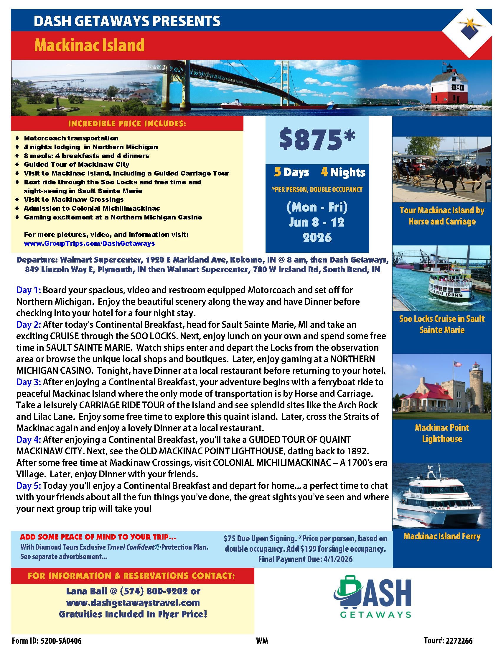 After enjoying a Continental Breakfast, you'll take a GUIDED TOUR OF QUAINT MACKINAW CITY. Next, see the OLD MACKINAC POINT LIGHTHOUSE, dating back to 1892. After some free time at Mackinaw Crossings, visit COLONIAL MICHILIMACKINAC – A 1700's era Village. Later, enjoy Dinner with your friends.