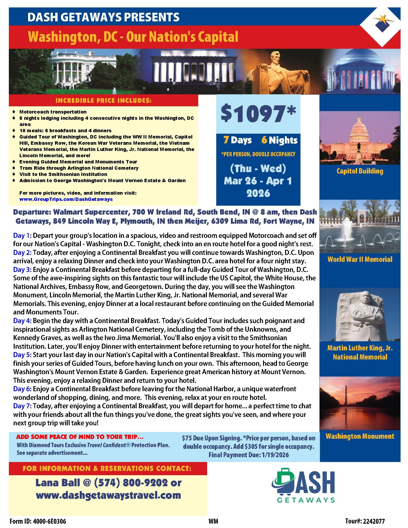 $75 Due Upon Signing. *Price per person, based on double occupancy. Add $305 for single occupancy. Final Payment Due: 1/19/2026