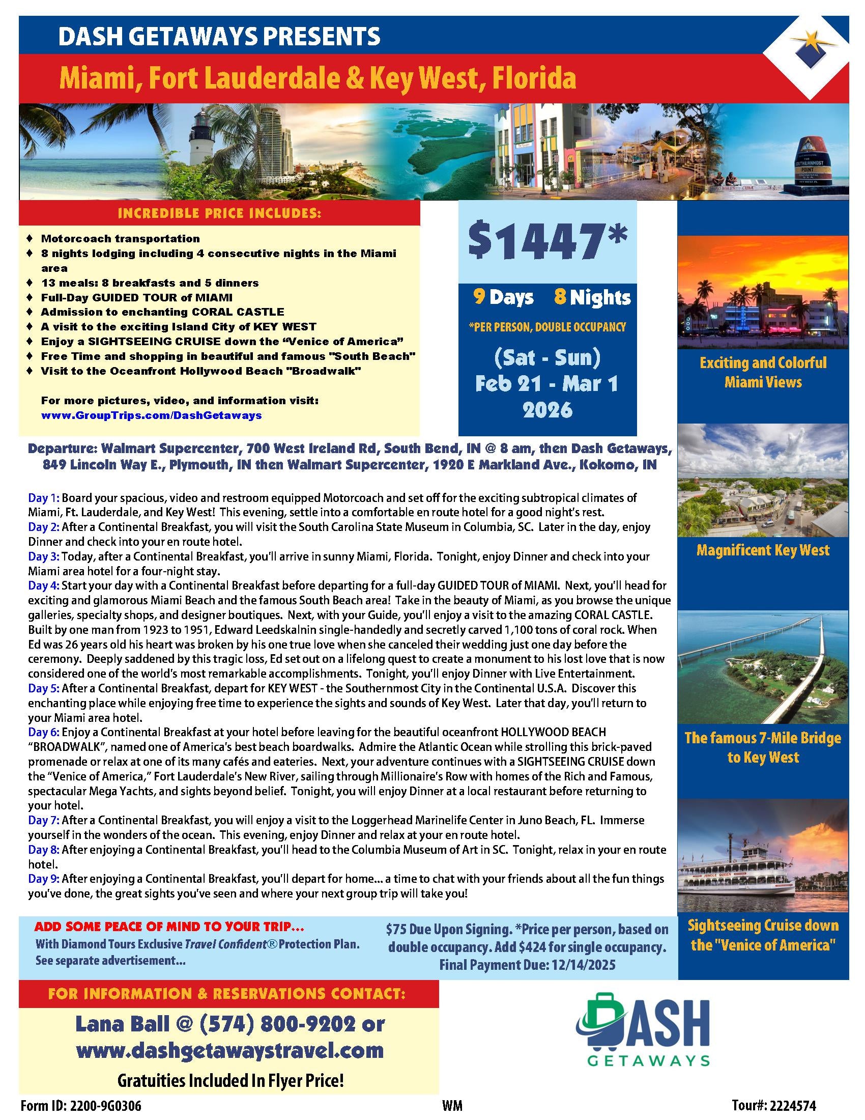 Departure Locations: South Bend, Plymouth, Kokomo, IN🌴 Escape to the Sunshine State! 🌊Join us for an unforgettable 9-day journey from the charming Carolinas to the vibrant subtropical paradise of Miami, Fort Lauderdale, and Key West! Along the way, you’ll explore fascinating museums, stroll Hollywood’s famed oceanfront Broadwalk, cruise past million-dollar mansions and mega-yachts, and uncover the mystery of the world-famous Coral Castle. Savor free time in colorful Key West—the southernmost point in the continental U.S.—and soak up the energy of Miami Beach’s iconic South Beach district. With guided tours, scenic cruises, cultural gems, and plenty of delicious dinners (including live entertainment), this trip blends history, beauty, and tropical fun into one extraordinary getaway. Pack your bags, grab your camera, and let’s make sunny memories together!