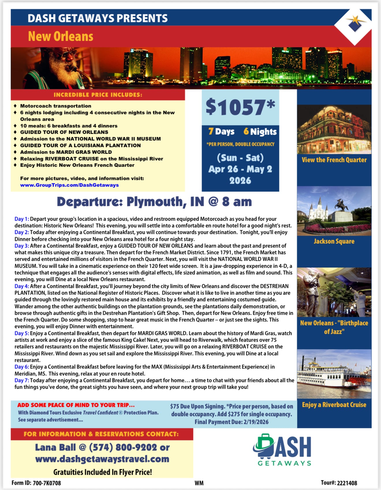 Day 7: Enjoy breakfast before departing for home. Share memories of the incredible sights, sounds, and flavors you’ve experienced — from the jazz rhythms to the southern hospitality — and start dreaming about where your next Dash Getaways adventure will take you.