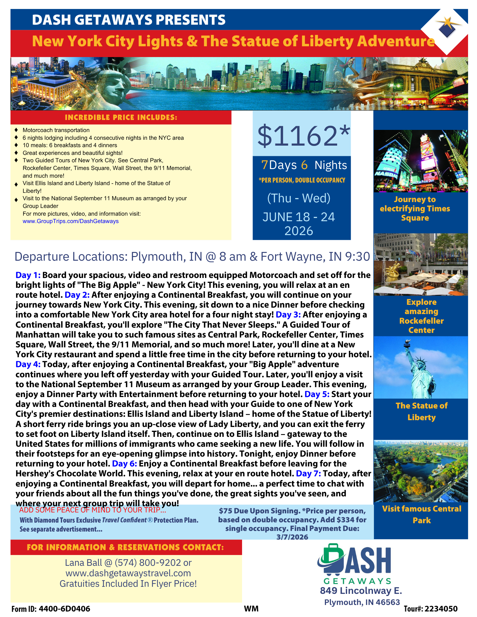 Motorcoach transportation 6 nights lodging including 4 consecutive nights in the New York City area 10 meals: 6 breakfasts and 4 dinners Two guided tours of New York City featuring Central Park, Rockefeller Center, Times Square, Wall Street, the 9/11 Memorial, and more Visit Ellis Island and Liberty Island – home of the Statue of Liberty Visit to the National September 11 Museum available as a special add-on through Dash Getaways (additional cost & early sign up required) Great experiences and beautiful sights throughout your journey